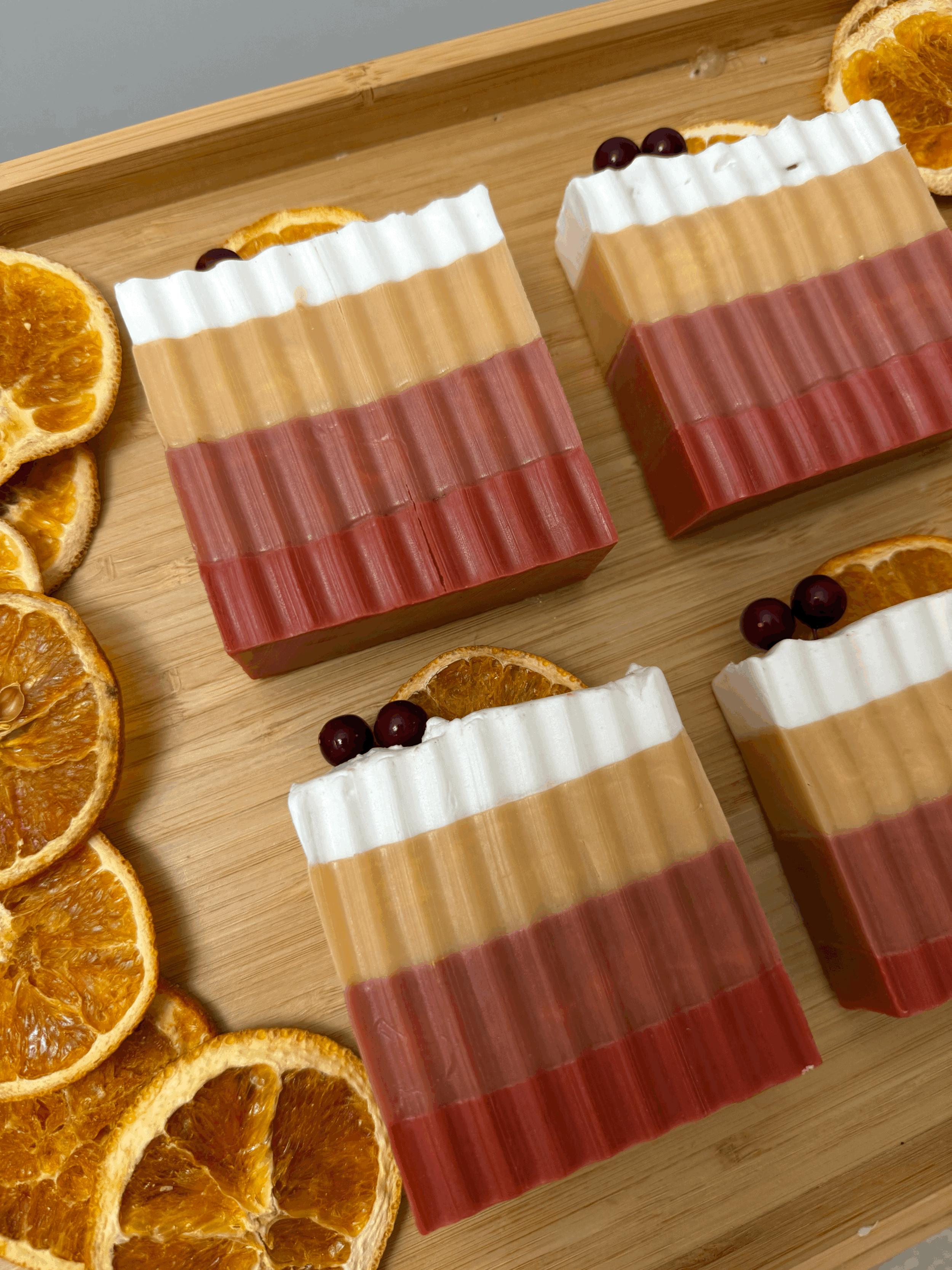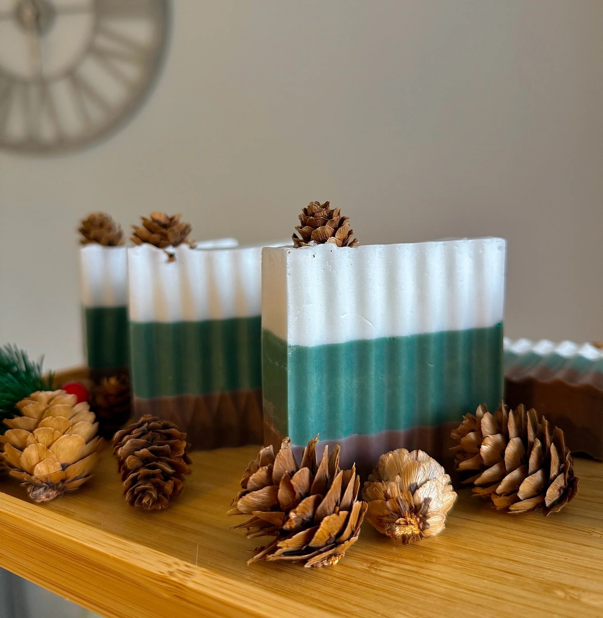 Three layered soap bars with white, green, and brown layers on a wooden surface, surrounded by pine cones.