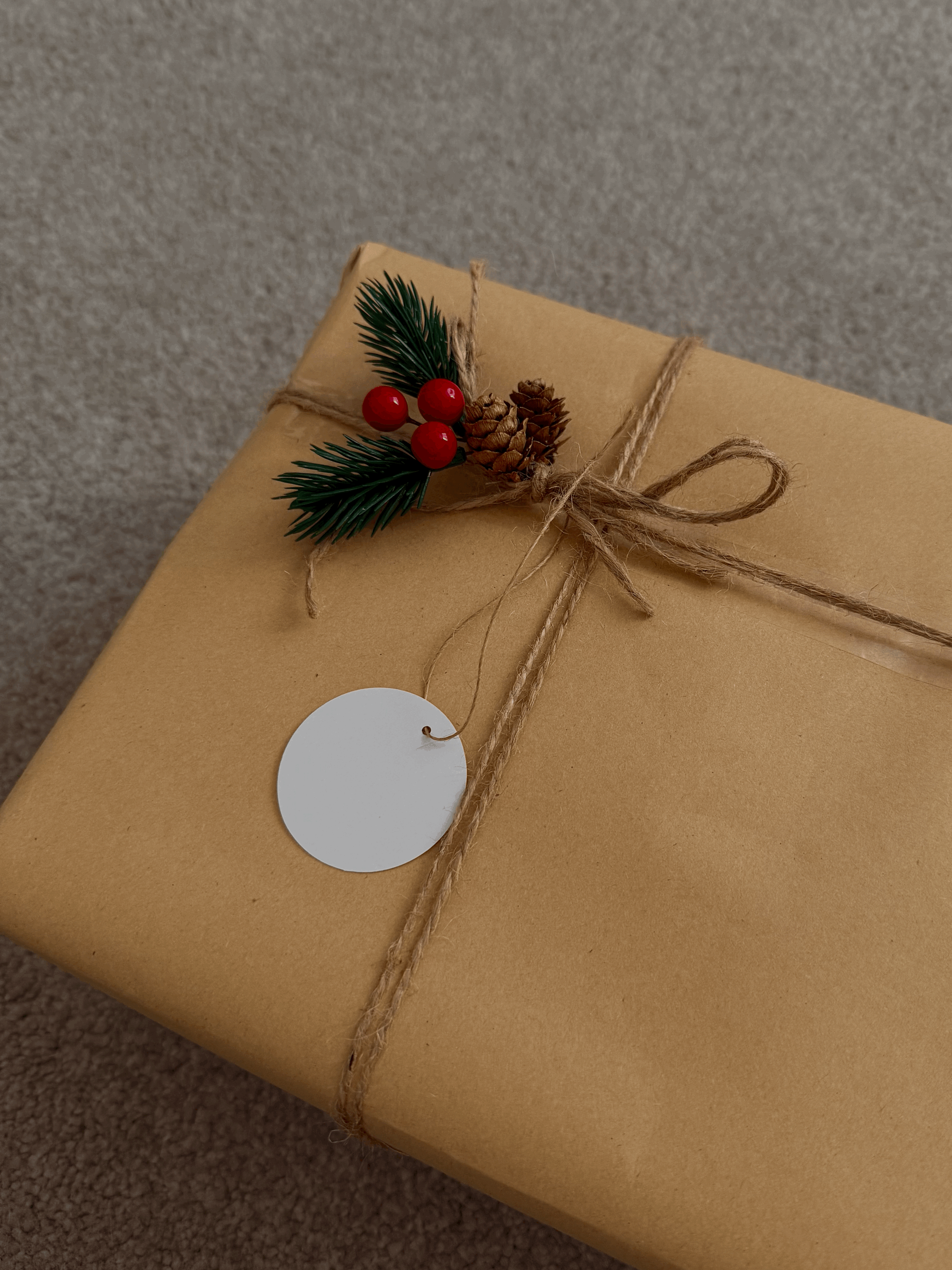 A wrapped Christmas gift in brown paper with a twine bow, decorated with a small sprig of pine, red berries, and pinecones.